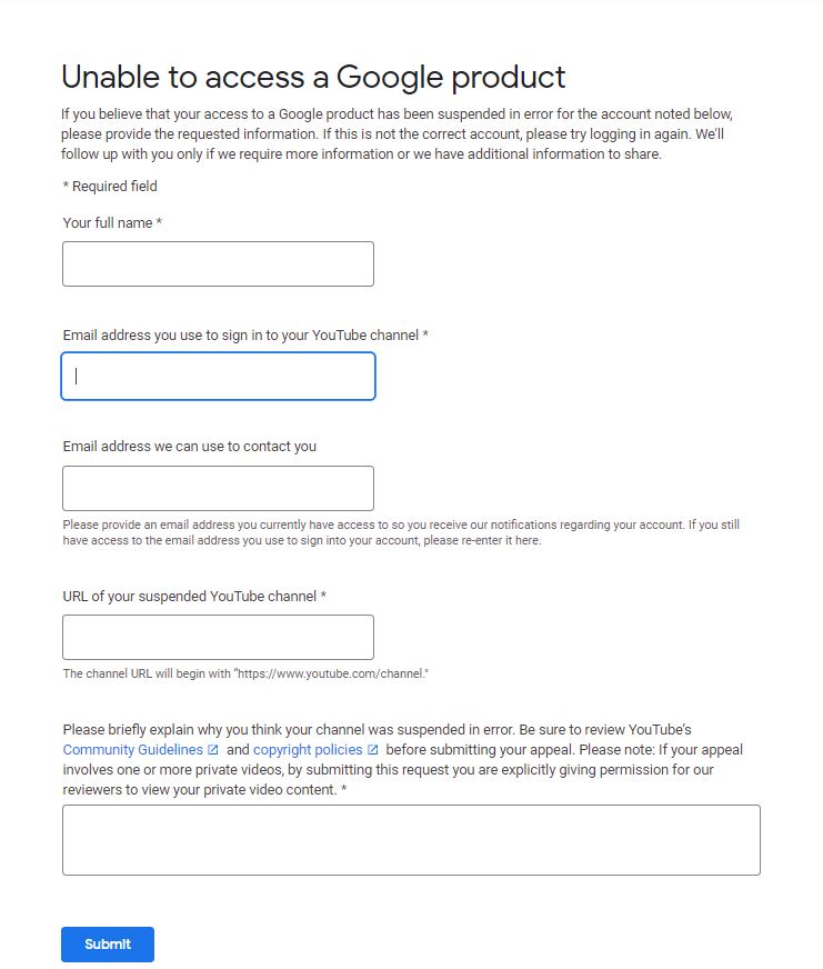 Chúng tôi muốn thông báo cho bạn rằng do vi phạm nhiều lần hoặc vi phạm nghiêm trọng Nguyên tắc cộng đồng của chúng tôi ( https://www.youtube.com/t/ Sau khi xem xét, chúng tôi đã xác định rằng hoạt động trong tài khoản của bạn đã vi phạm Nguyên tắc cộng đồng của chúng tôi, điều này cấm spam, lừa đảo hoặc nội dung lừa đảo thương mại ( https://support.google.com/ Xin lưu ý rằng bạn bị cấm truy cập, sở hữu hoặc tạo bất kỳ tài khoản YouTube nào khác. Để biết thêm thông tin về việc chấm dứt tài khoản và cách Nguyên tắc cộng đồng của chúng tôi được thi hành, vui lòng truy cập Trung tâm trợ giúp của chúng tôi . Nếu bạn muốn kháng cáo việc đình chỉ, xin vui lòng gửi mẫu này . <-------- Đến đây các bạn đã hiểu vấn đề gì rồi chứ! Nhưng khi vào bên trong mẫu kháng cáo lại là cả 1 vấn đề đấy |